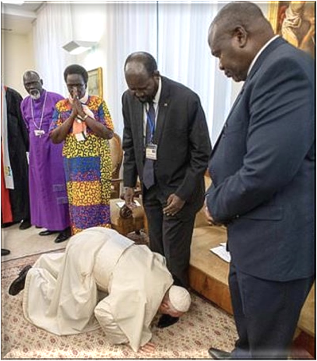 Cependant, je suis sûr que je dois revenir sur cette information la plus pertinente aujourd’hui et la re-présenter aux gens avec mes commentaires et explications, ce qui assurera la véracité et la pertinence de cette information, et aussi pompeuse que cela puisse paraître – la capacité de comprendre ce qui se passe aujourd’hui – les participants dont nous sommes – que nous le voulions ou non. Et quand j’ai vu la vidéo qui m’a été envoyée, qui capture l’événement – qui ne rentre dans aucun cadre de bon sens – le pape François embrasse les pieds des dirigeants du Soudan du Sud, j’ai réalisé que je faisais tout correctement. Il s’agira d’articles (blocs d’informations) sur les défis et incidents actuels les plus pertinents, mais pour ceux qui sont intéressés, je recommande tout d’abord de regarder la source principale.